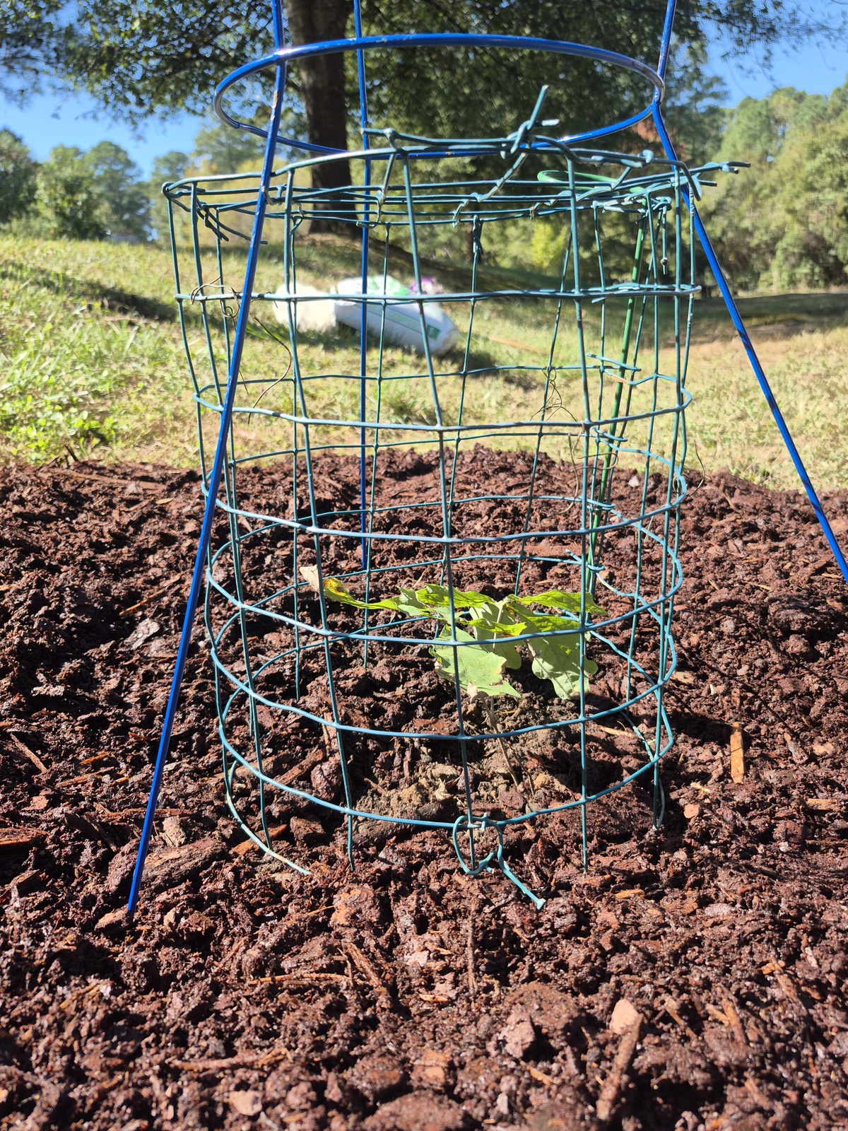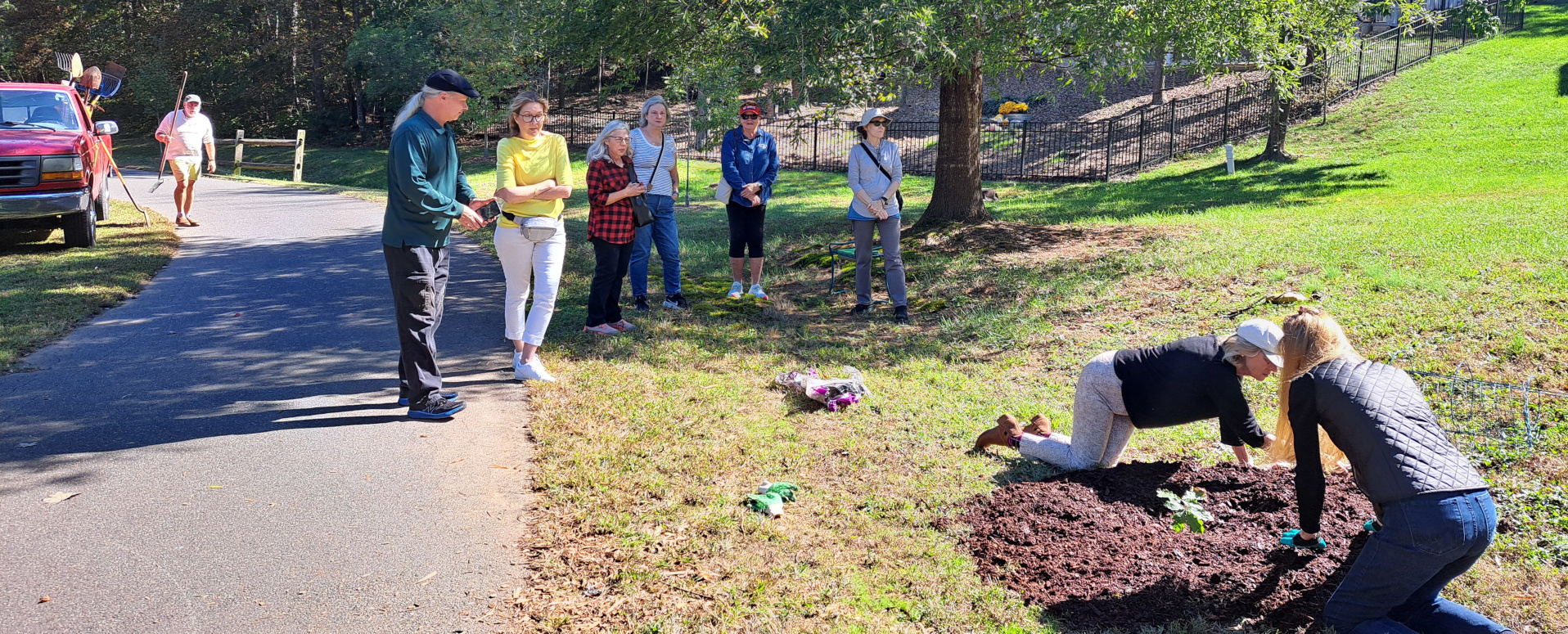 Lois Nixon, Charlene Jones, Michael Rubes, Kerry Mead, Teresa Sothcott, Denise Tally, Jennifer Adams, and Fran Brocato, of the Friends of the Page-Walker, along with Richard Carroll and George McDowell, plant a historic and notable tree under the watchful eyes of a Red-shouldered hawk and hundreds of bluebirds, goldfinches, and Carolina wrens feasting on seeds from the Longleaf pine savanna re-creation across the greenway from the tree's site just off the path of the White Oak Greenway.